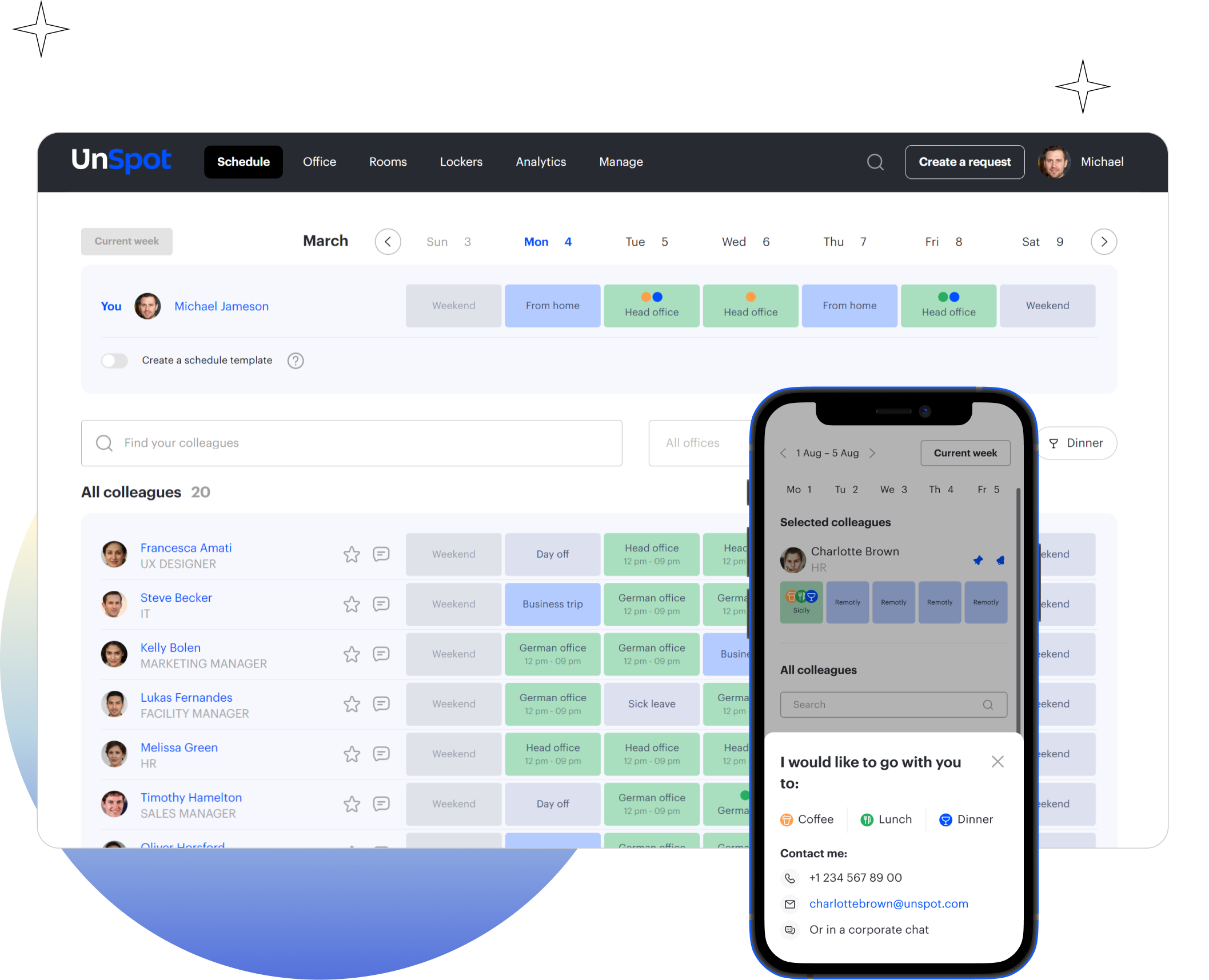 The hot desk booking software includes a weekly schedule dashboard to help you synchronize your team’s or department’s attendance. Employees can check in real time where their colleagues are seated and when they will be in the office.