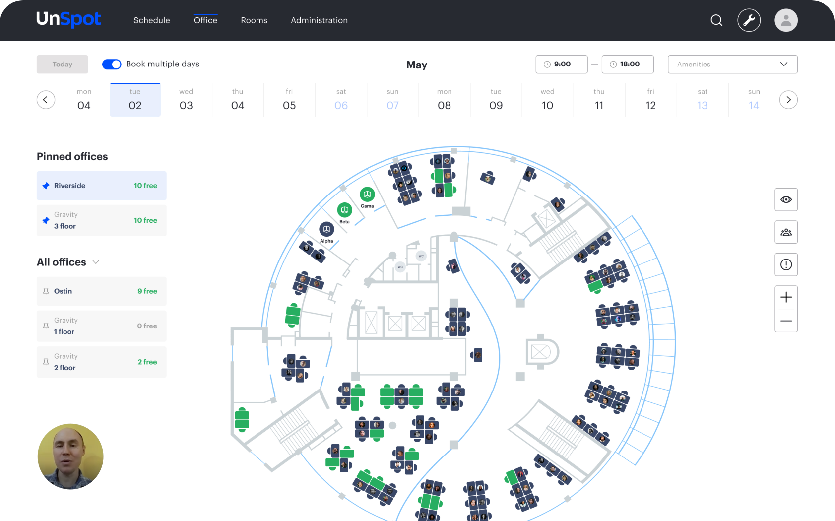UnSpot includes desk booking system, work scheduling, office analytics, navigation and interactive maps