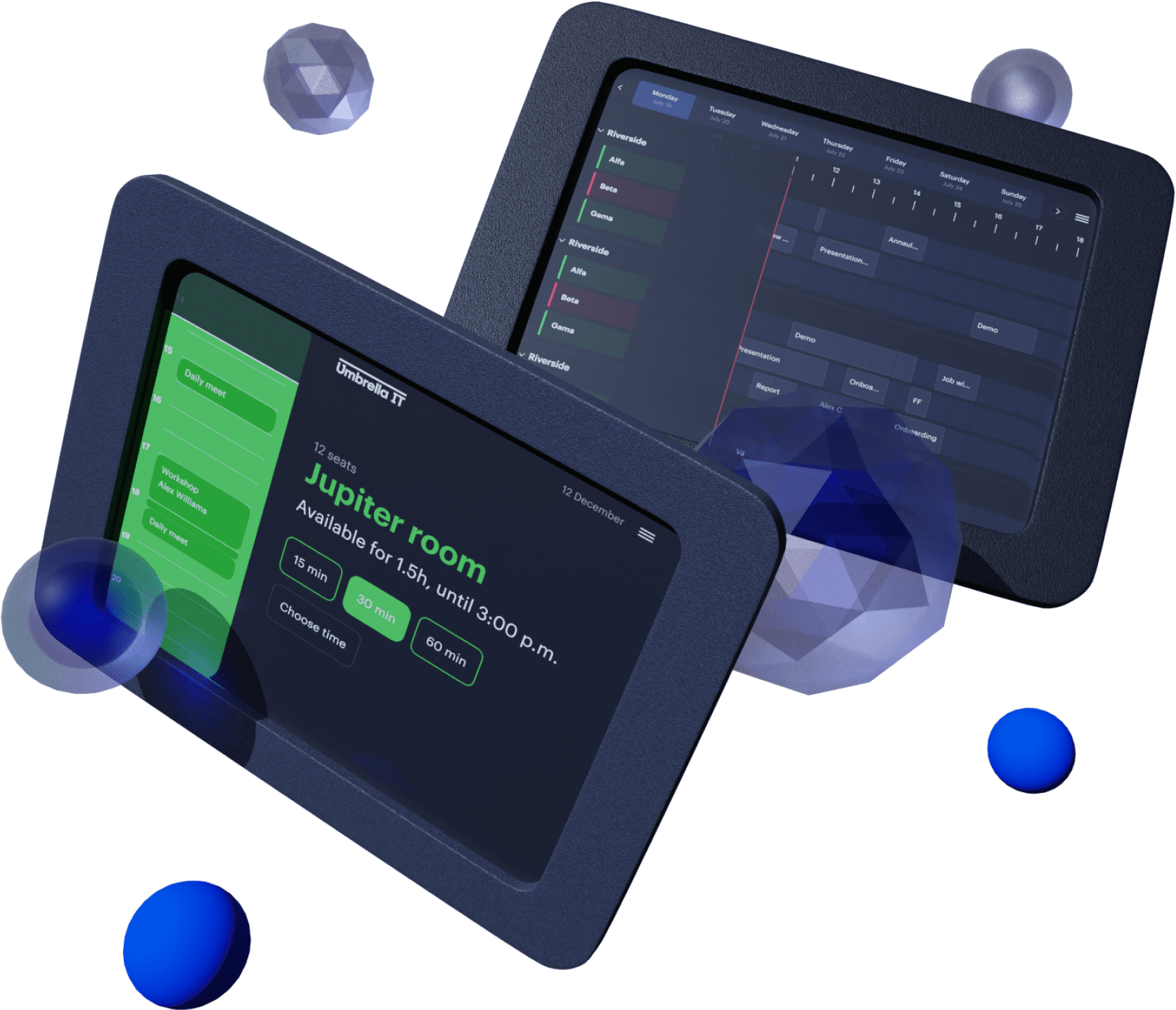 Easily book meeting rooms in your office for available time slots right near the entrance to those rooms and use the color-coded indication to quickly check the availability of the room you need.