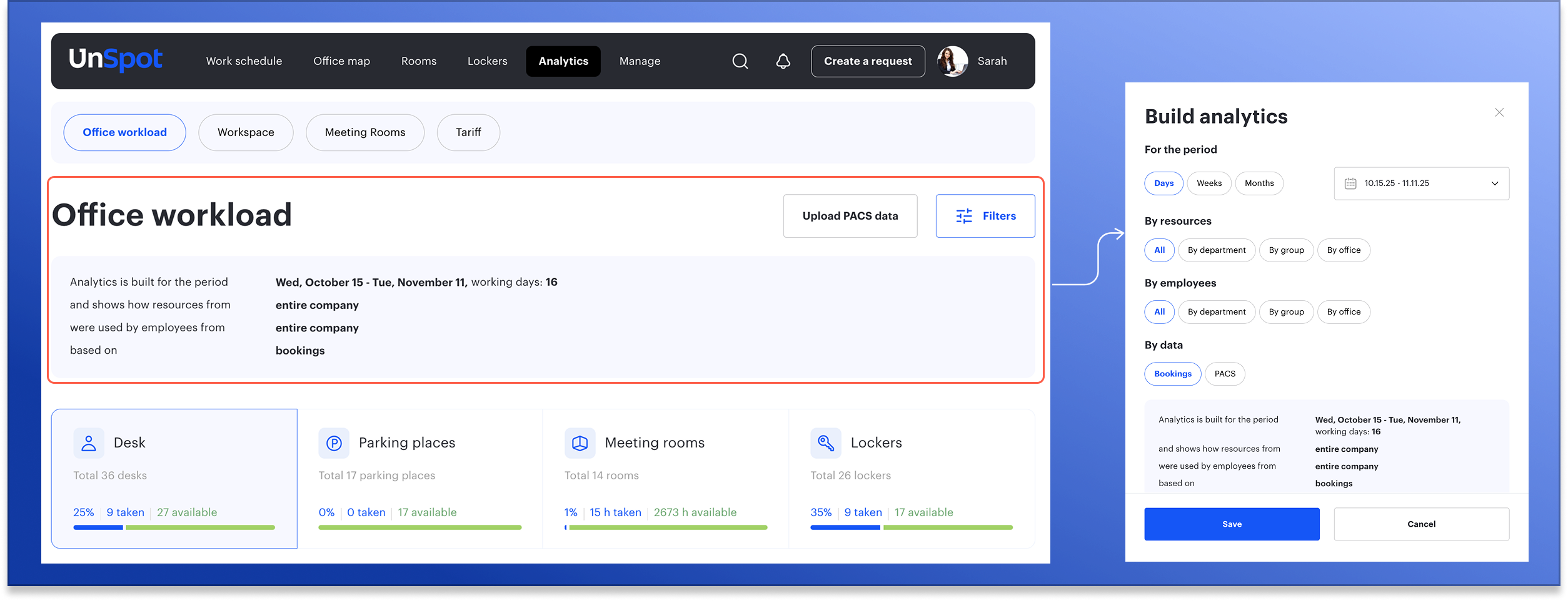You can see how workspaces, meeting rooms, parking spots, and lockers are used across teams and locations, compare occupancy levels, and assess efficiency. Resource filters define which objects are counted in the analytics, while employee filters determine whose bookings are included.