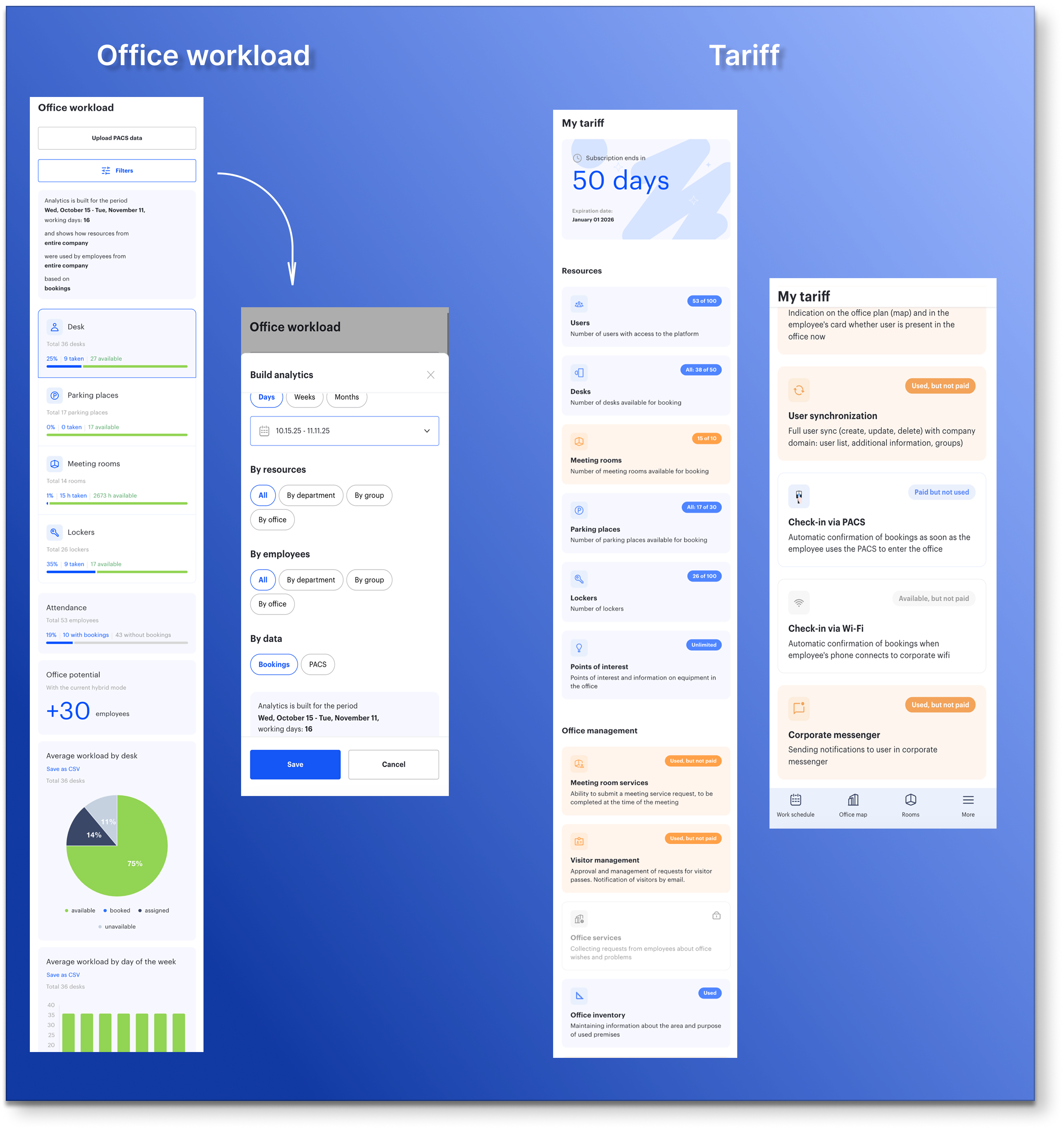 Managers and administrators can monitor office space usage, employee activity, and tariff consumption anytime, from any device.
