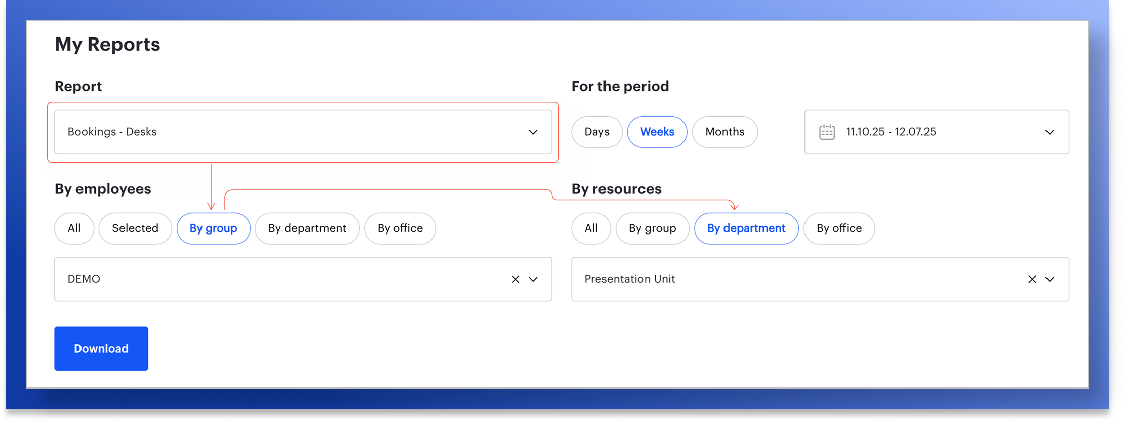 You can now generate detailed booking reports by offices and organizational units directly in the “My Reports” section. With the updated filters, it’s easier to analyze how different departments, teams, and office locations use workplace resources.