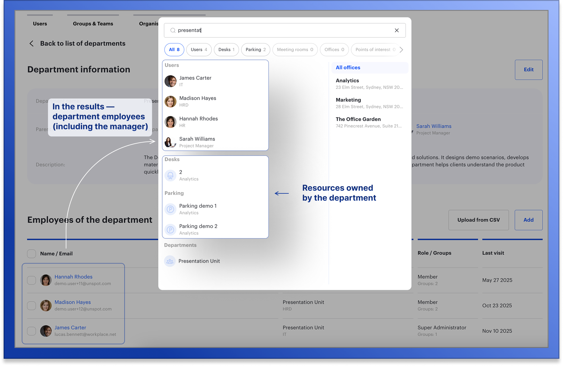 Global search can now find employees and resources by a specific department in the org structure. When you enter the department name, you immediately see all employees assigned to it — including the manager — as well as desks, parking places, and meeting rooms associated with that department.