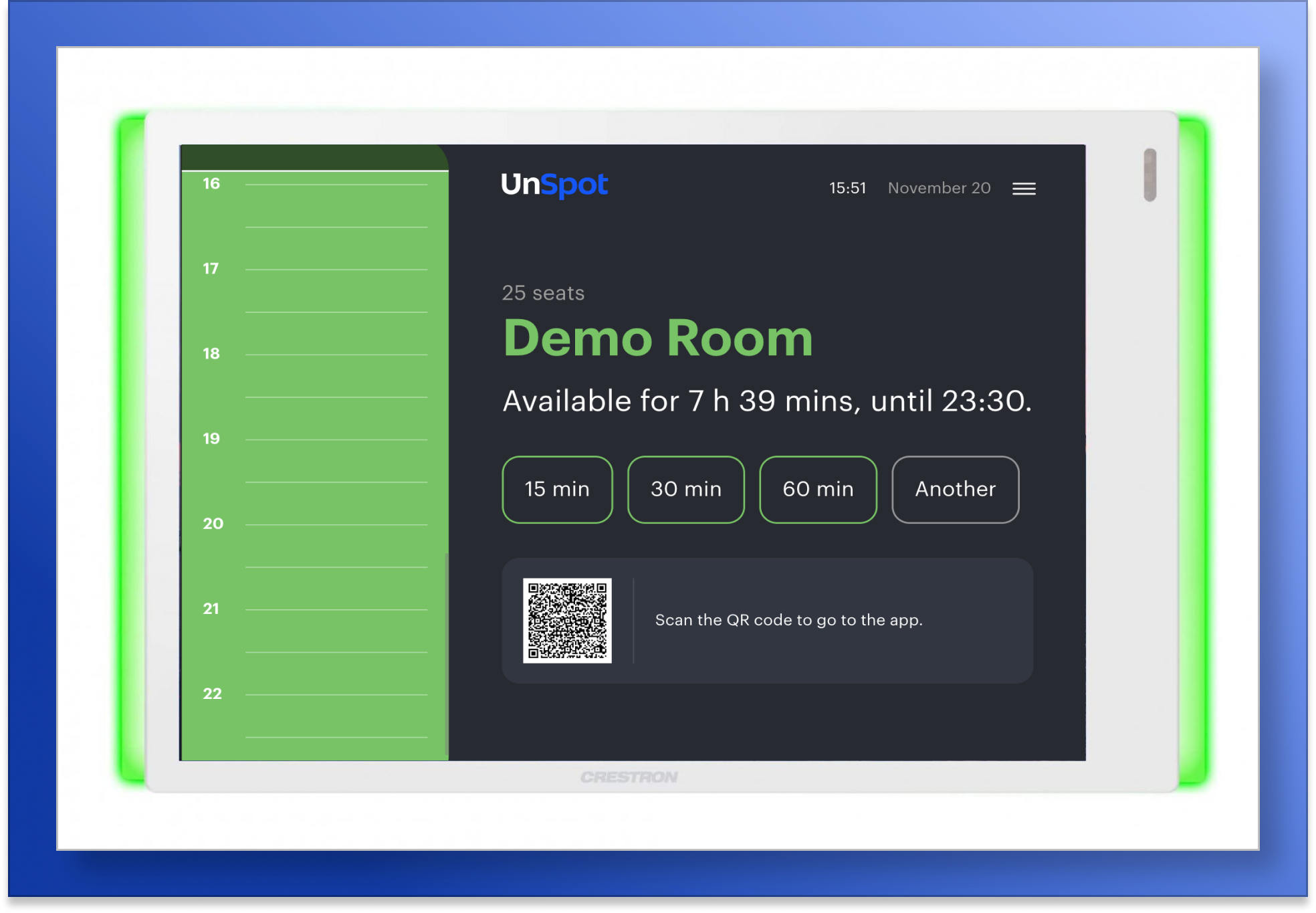 LED indicators on Crestron panels now display the current status of a meeting room. The indicator color shows the room’s availability: red means the room is occupied, green means it’s free, and yellow indicates that a booking is awaiting approval.