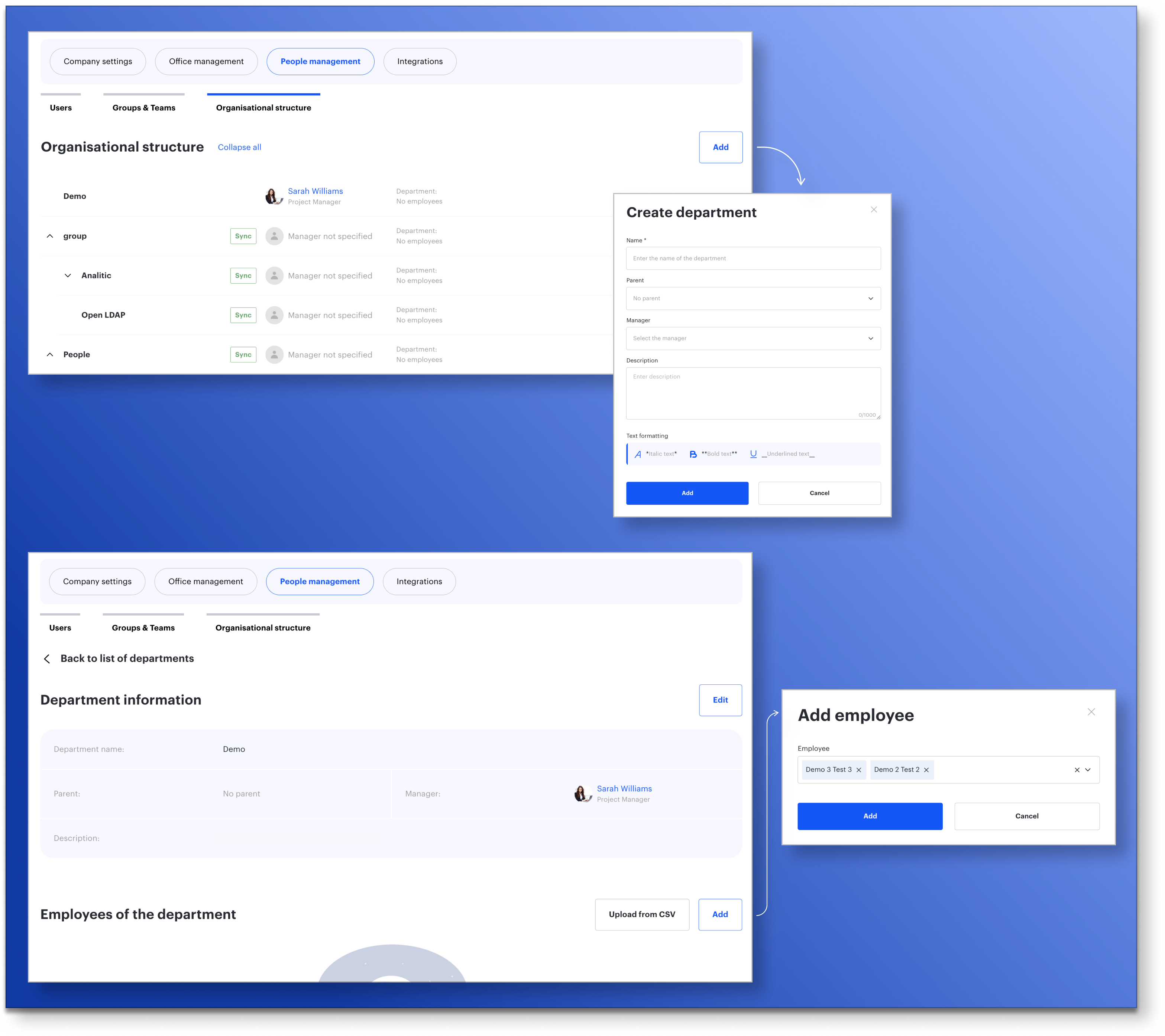 Employees can be added manually from the list or imported in bulk via CSV — and removed from a department just as easily. The module is linked to the “Users” page: by clicking on the number of employees in a department, you’ll see the full list with filters, making navigation even more convenient.