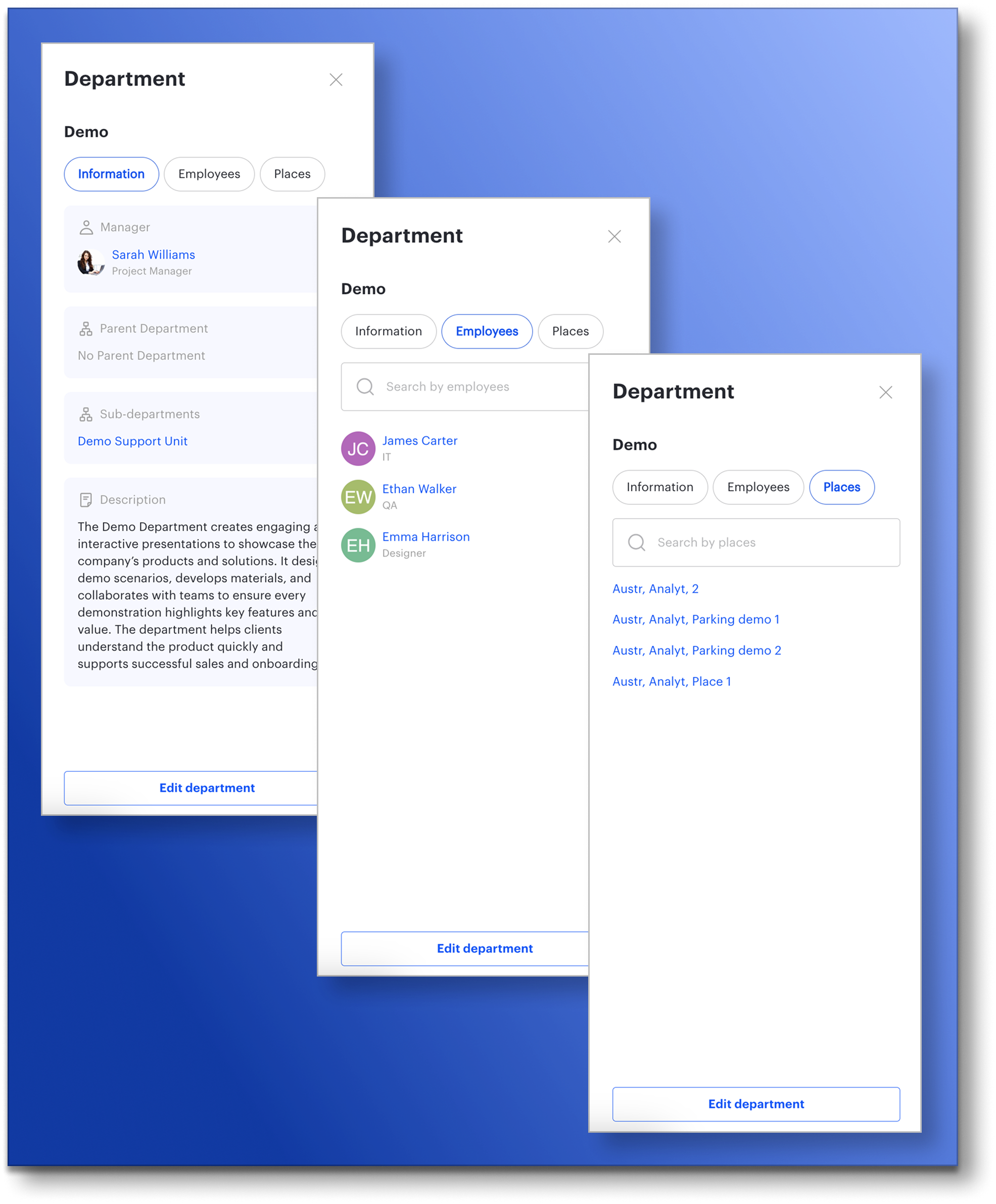 The department card, similar to the user card, has three tabs: Information, Employees, and Places.