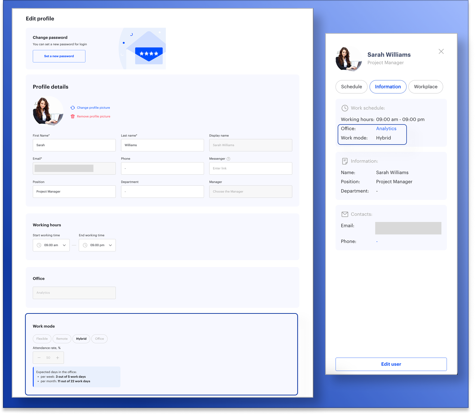 A “Work mode” section has been added to the user profile, showing the assigned work mode and attendance requirement. This section is view-only, so data cannot be changed accidentally.