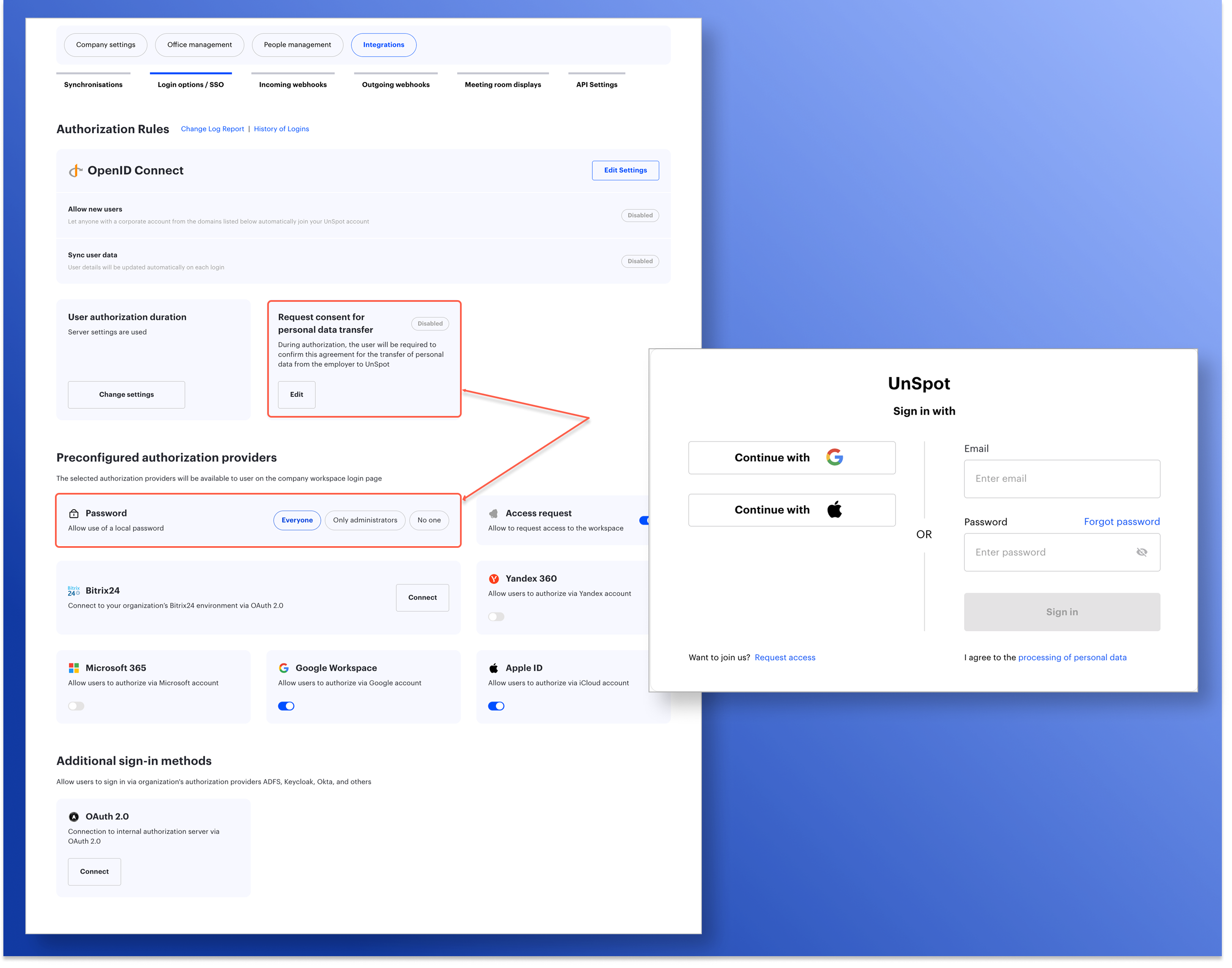We have expanded the authorization settings to help companies better comply with security requirements and personal data processing policies. It is now possible to configure the display of request consent for personal data transfer: a link to the relevant document can be added in the admin panel and shown to users on the login screen.