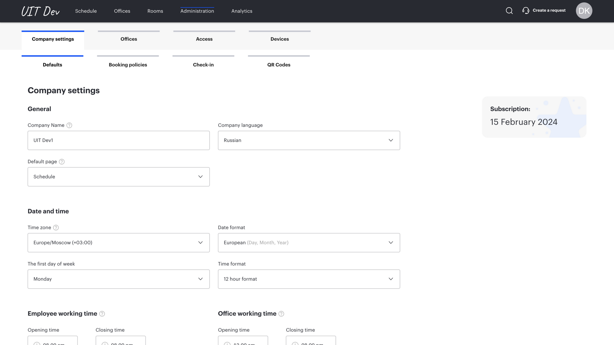 The settings have been split into 3 groups: General, Date and time and Working time. You can also now see information about subscriptions.